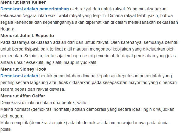 Kali ini Blog Sistem Pemerintahan akan membahas tentang Demokrasi di Indonesia. Fokus pembahasan antara lain: Pengertian Demokrasi, Budaya Demokrasi Pendidikan,, Sejarah dan Perkembangan Demokrasi di Indonesia, serta Pelaksanaan Demokrasi di Indonesia.